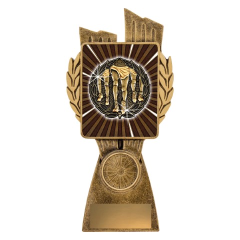 Antique Gold Lynx trophy features a classic wreath design and vibrant theme. These running trophies offer the option of including your custom logo over various sizes.