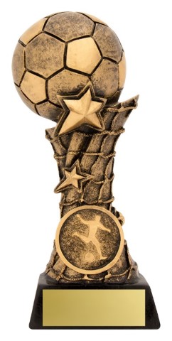 Effective design that showcases the football atop a stylish goal net tower – finished in classic antique gold colours and black base. This design starts at a reasonable price point making this generic theme a great choice for participation awards. Space for insert also present.