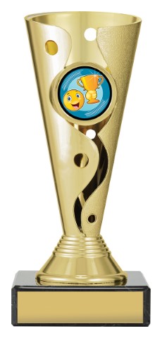 Carnival cups present a distinctive cup style trophy with attractive 3D design – on classic black marble base for your engraving – with brightly coloured insert for your sport. Trophies adaptable to your custom requirements.
