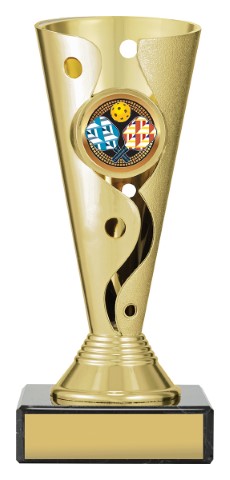 Carnival cups present a distinctive cup style trophy with attractive 3D design – on classic black marble base for your engraving – with brightly coloured insert for your sport. Trophies adaptable to your custom requirements.