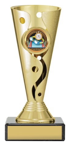 Carnival cups present a distinctive cup style trophy with attractive 3D design – on classic black marble base for your engraving – with brightly coloured insert for your sport. Trophies adaptable to your custom requirements.