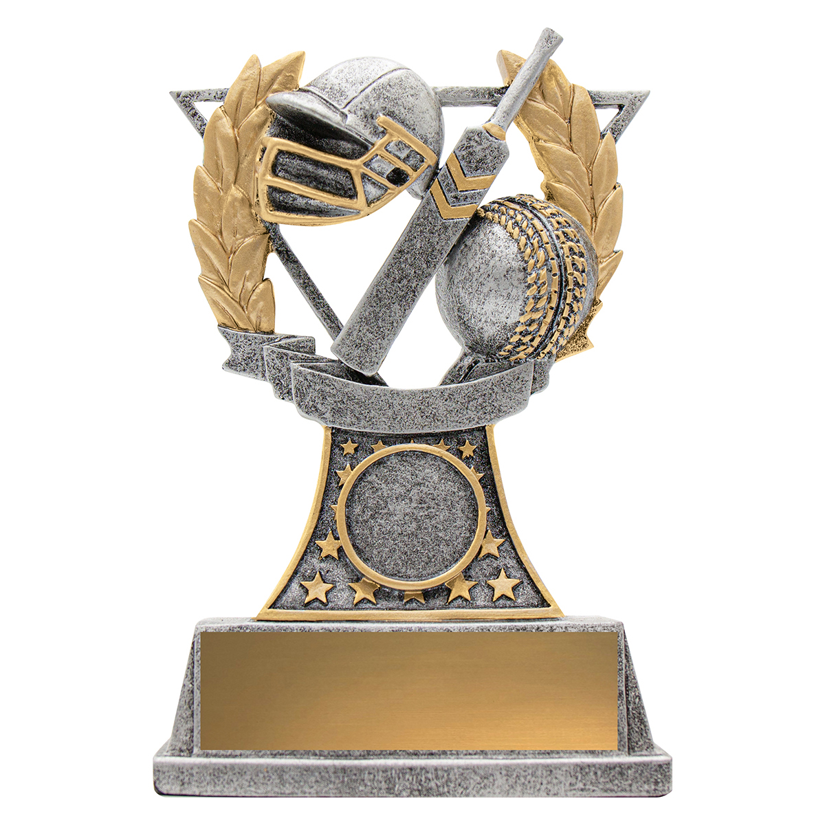 Classic wreath and stars inspired design of cricket trophy and features iconic cricket elements. Cricket trophies perfect for your logo insert and ample space for engraving.