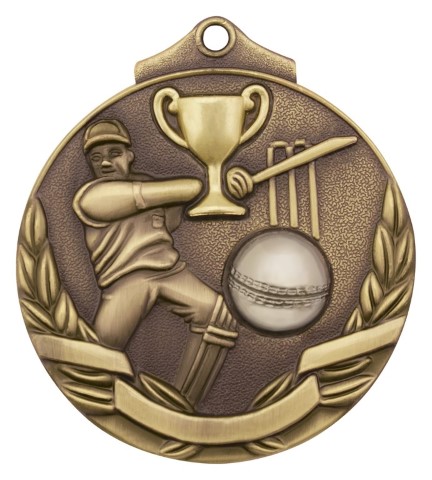 Classic antique medal featuring distinctive two-toned design. Medal a fantastic option for Cricket awards with interesting design. Ribbons available in all colours and medal boxes to suit.