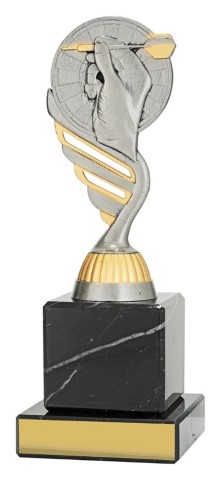 Classic darts theme finished in antique trophy silver on premium black marble over multiple sizes.
