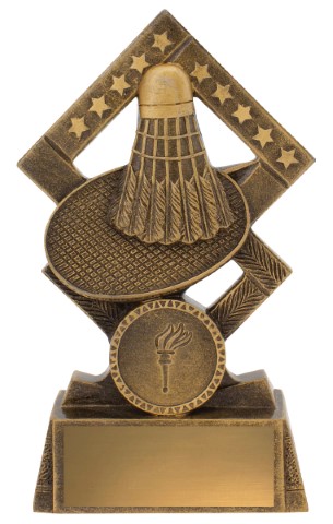 Excellent pair of badminton trophies well suited for larger club orders feature racquet & shuttlecock design and eye-catching multi-star elements. Great position for your club insert.