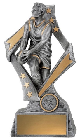 Dynamic footy trophies feature male player in action framed by a stylish star inspired design. Aussie rules trophies are finished in classic antique silver and gold. Perfect for various best player award categories.