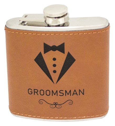 Stainless steel flask wrapped with rawhide leatherette. Terrific gift idea for achievements and celebrations with space for your engraving.