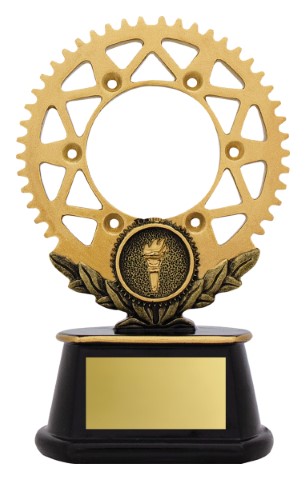 Motorsport trophy – the Gear series – is a distinctive design and provides option of 3 sizes. Substantial in size and completed in gold with classic black base.