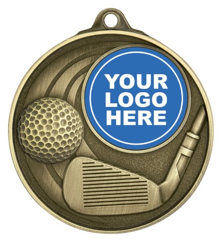 Popular medal design features golf and club elements with space to include your 25mm custom logo. Engraving space on the back of the medal.
