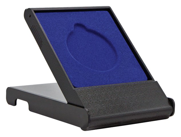 Plain medal box for 50mm medals. Black case with blue felt inlay. Space for engraving plate.