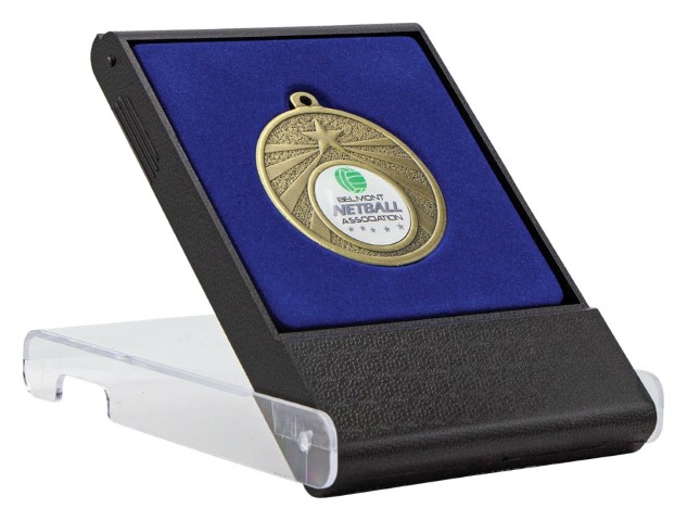 Plain medal box for 50mm medals. Black case with blue felt inlay. Space for engraving plate. Clear outer case for display purposes.