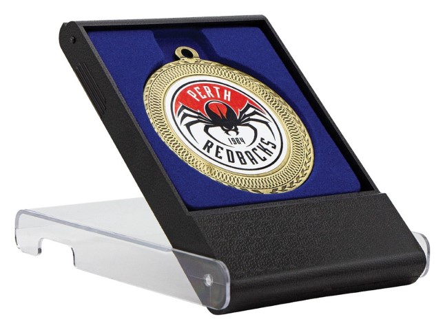 Plain medal box for 70mm medals. Black case with blue felt inlay. Space for engraving plate. Clear outer case for display purposes.