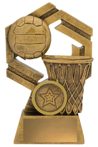 Eye-catching design that features classic netball elements of ball and net. Netball trophies finished in traditional antique gold with space for custom insert.