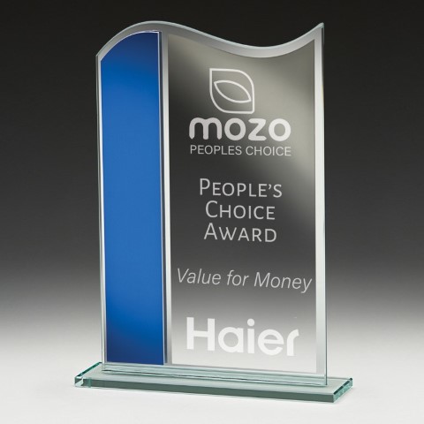 The Ohana series of budget glass awards offers an elegant wave inspired design with an appealing shiny blue & silver panel. Central space for your engraving.