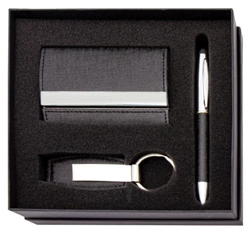 Gift set option with pen, keychain and card holder.