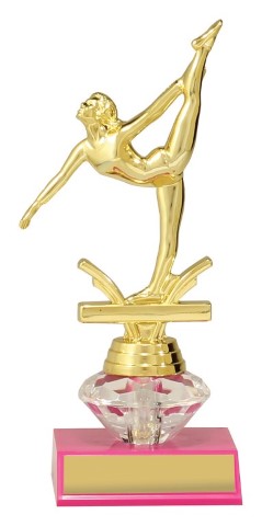Stylish ‘diamond’ trophies ideal for dance and performing arts. With pink base and diamond riser, trophies are finished with bright gold dance figure.