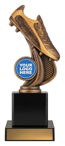 Excellent series of football boot trophies feature classic black timber and stylish antique gold top with space for your club logo.