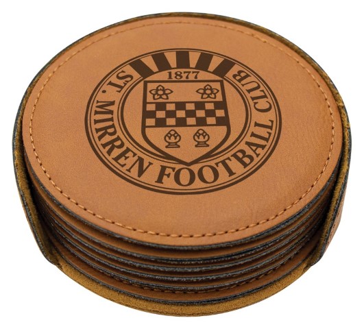 Rawhide set of 6 coasters feature a stylish circle design within tailored holder – personalise with a special message or showcase a custom design or logo.