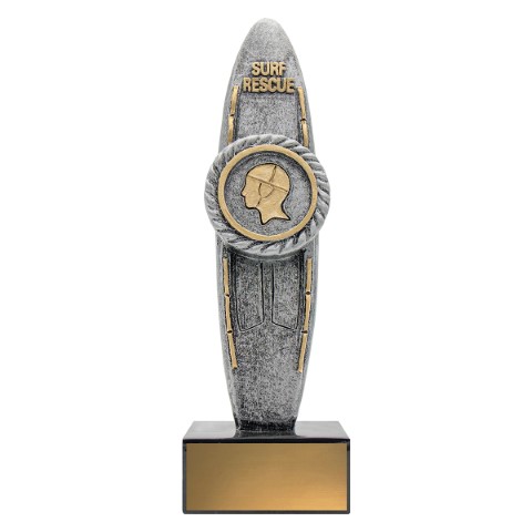 Versatile lifesaving trophy with central rescue board element and prime position for your custom logo if required.