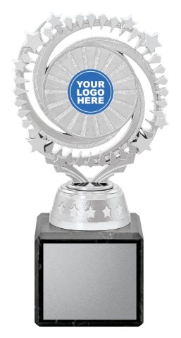 Swirling silver holder with multi star elements to showcase your custom logo over number of sizes.