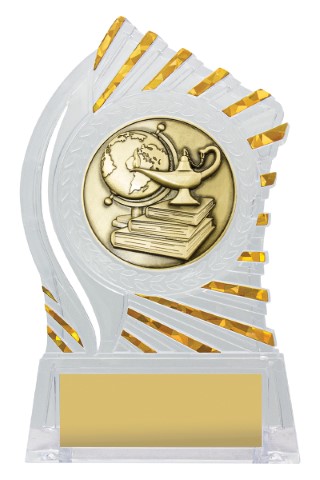 Exciting design of acrylic trophy showcases the gold theme for your sport or trophy. An affordable award with terrific space for your engraving.