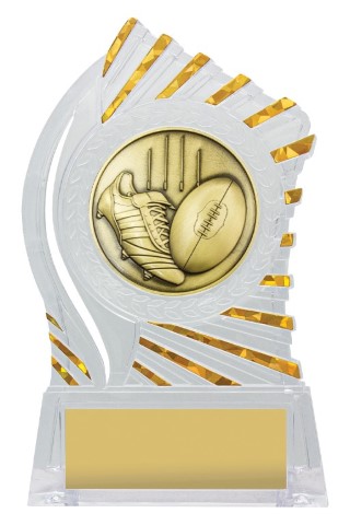 Exciting design of acrylic trophy showcases the gold theme for your sport or trophy. An affordable award with terrific space for your engraving.