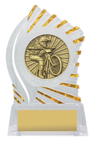 Exciting design of acrylic trophy showcases the gold theme for your sport or trophy. An affordable award with terrific space for your engraving.