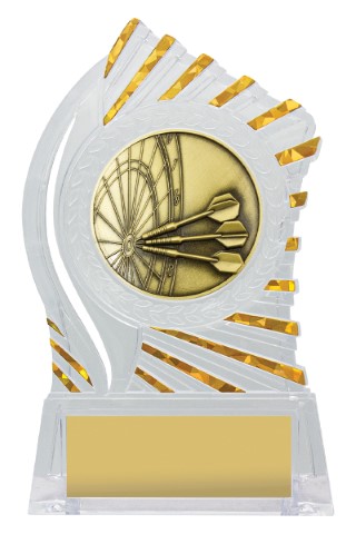 Exciting design of acrylic trophy showcases the gold theme for your sport or trophy. An affordable award with terrific space for your engraving.