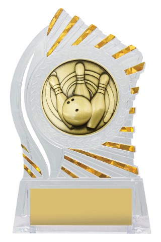 Exciting design of acrylic trophy showcases the gold theme for your sport or trophy. An affordable award with terrific space for your engraving.