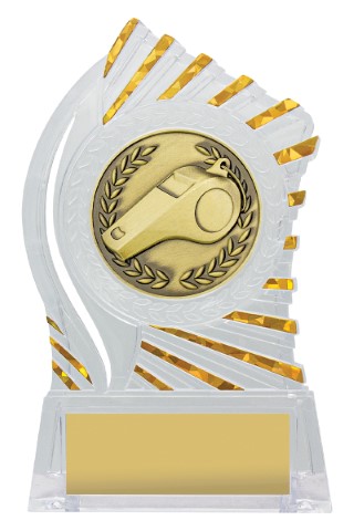 Exciting design of acrylic trophy showcases the gold theme for your sport or trophy. An affordable award with terrific space for your engraving.