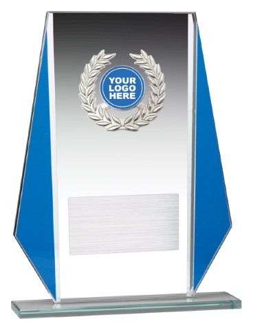 Standout glass award that still suits your budget needs. Clear glass trophy with bright blue accents and central space for your logo.