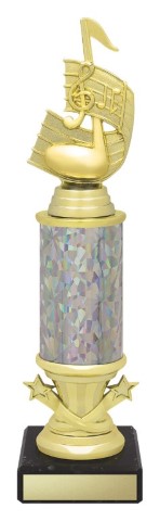 Outstanding series of music trophies feature star riser component and classic music note theme in shiny gold. Change colour of column to suit your awards.