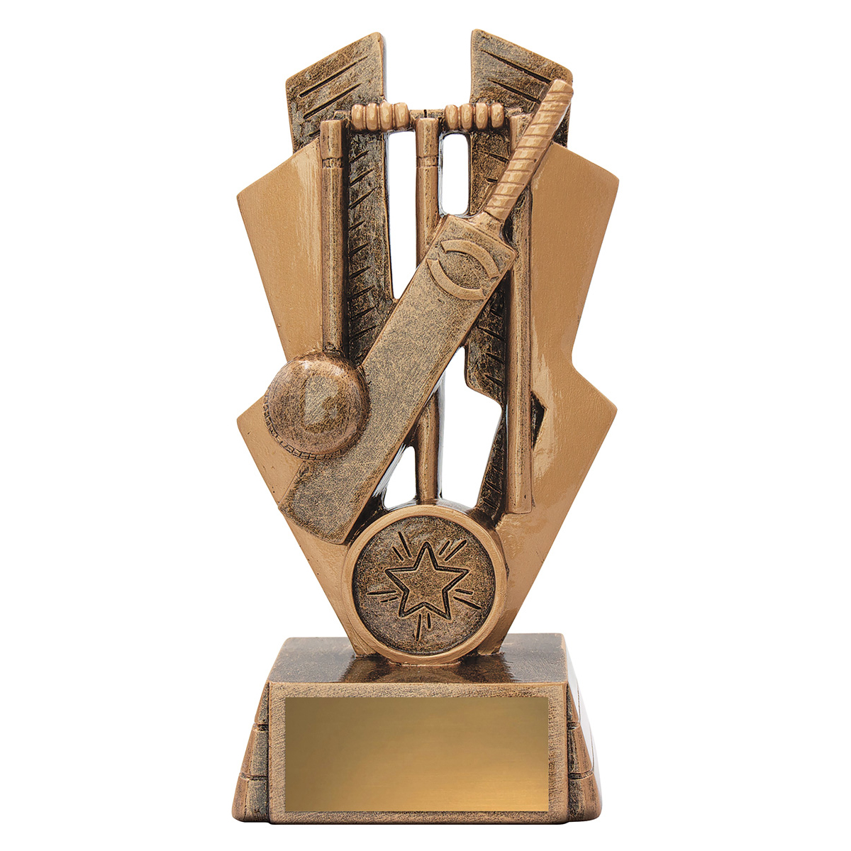 Brilliant series of gold trophies for cricket with lightning bolt features and elements for your sport. Central space for logo.