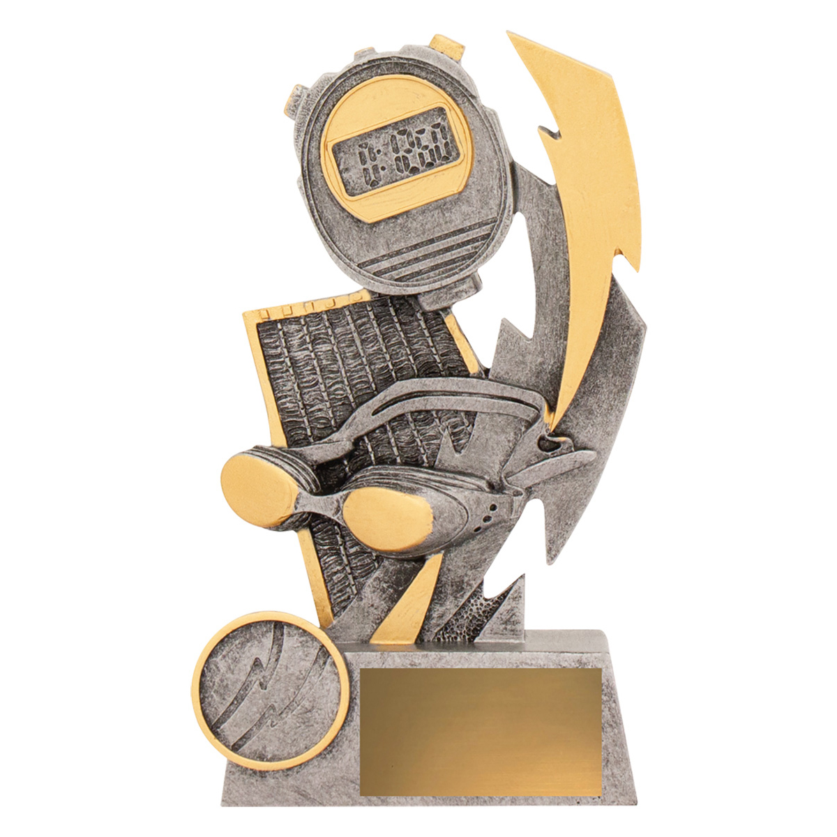 An exciting flash inspired design, the Shazam Series in a vibrant silver & gold combination, is perfect for various awards at your event. Swimming trophies feature the space for your logo if required.